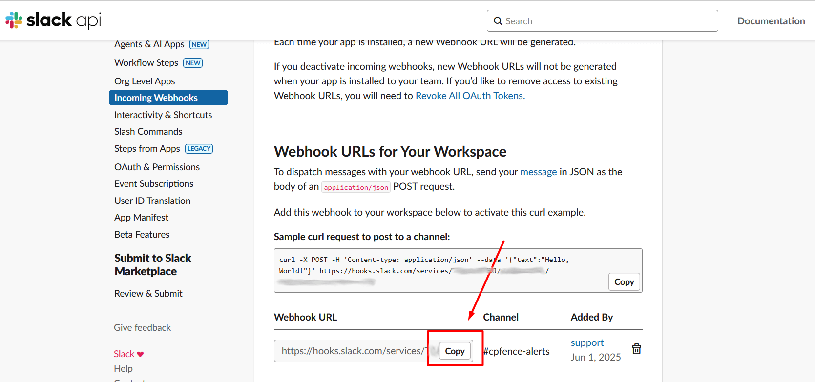 1. Slack will show your new Webhook URL.