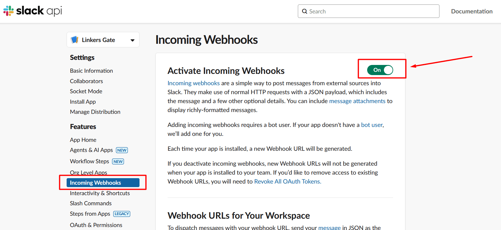 1. In the app settings, go to Incoming Webhooks, and turn it on.