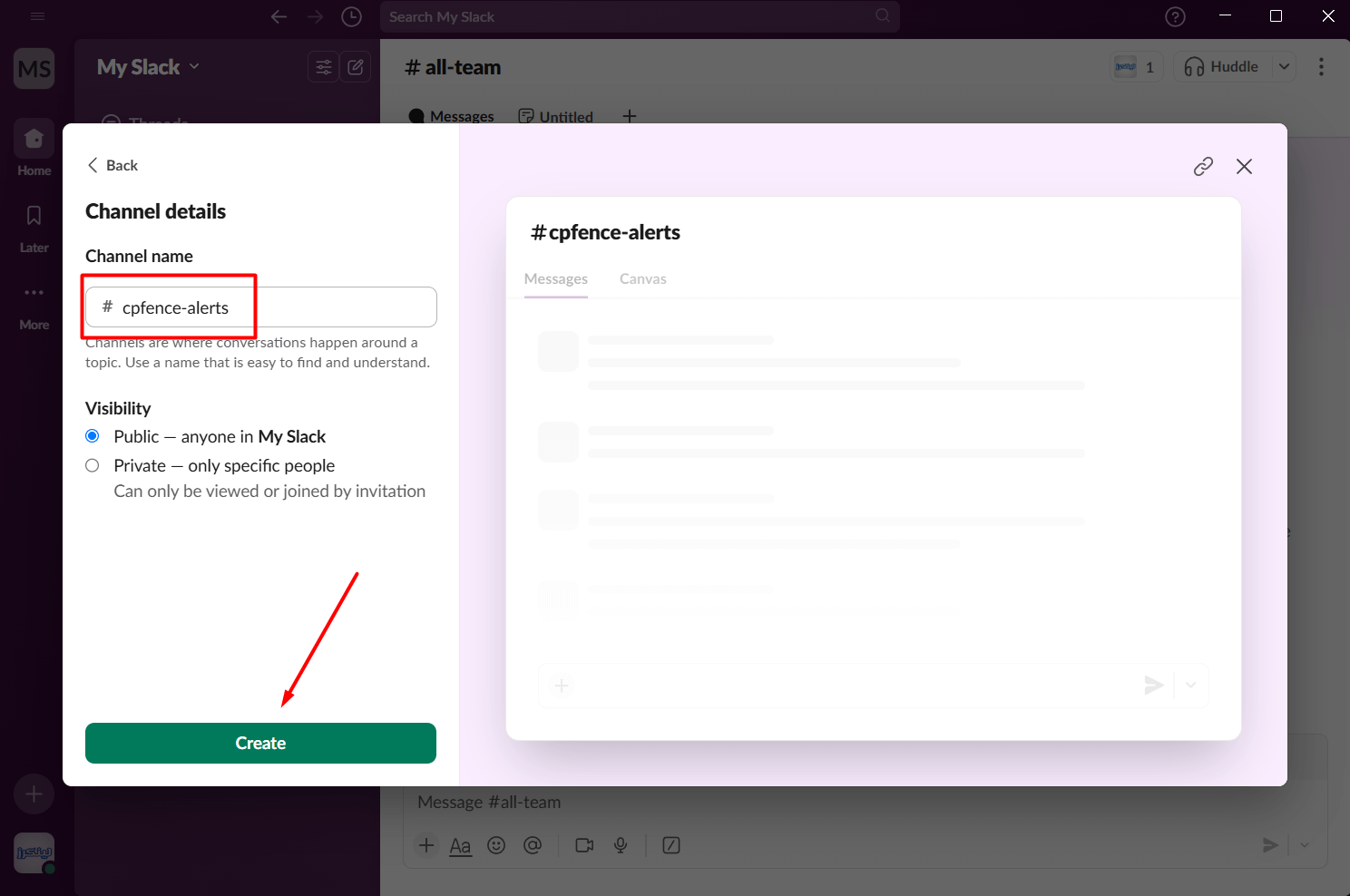 4. Name your channel (e.g. #cpfence-alerts) and click Create.