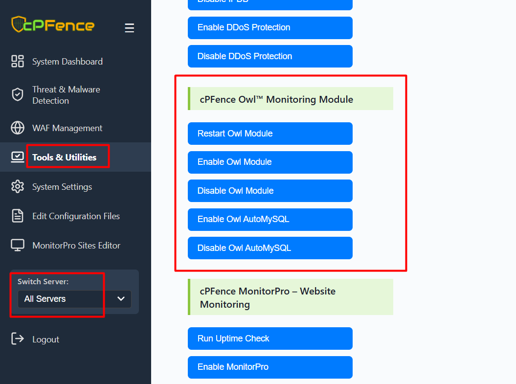 cPFence includes a browser-based WebUI that is fully mobile-friendly, allowing you to manage Owl Monitoring on any server from your desktop or phone. You can select a specific server or manage all servers at once using the sidebar dropdown.
