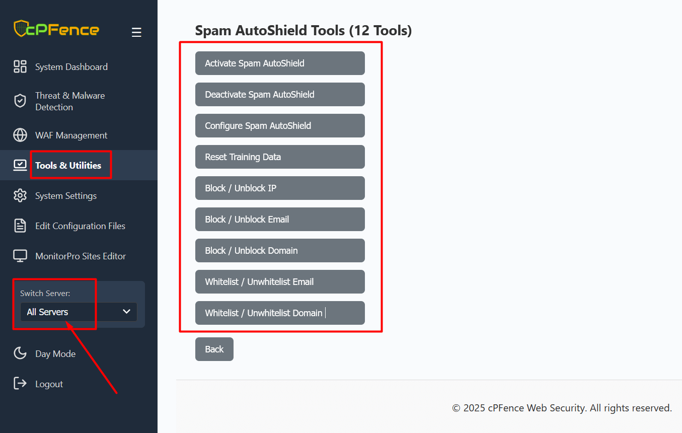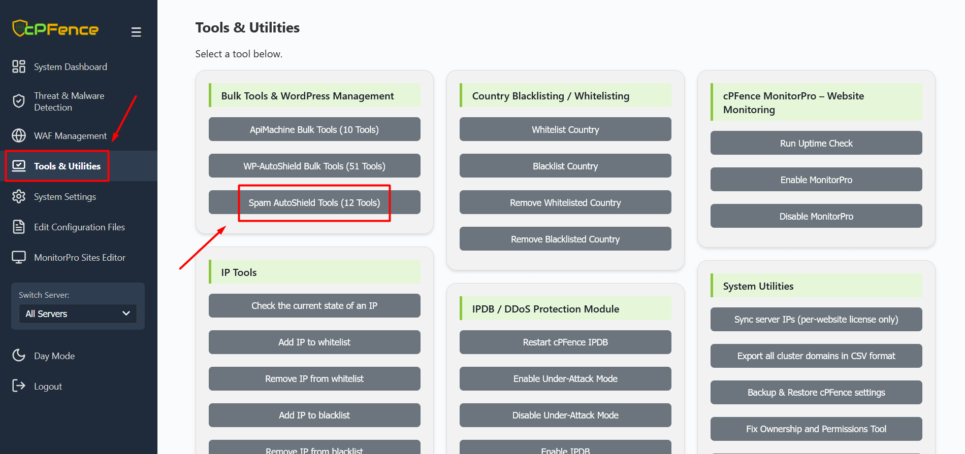 - From the left menu, go to Tools & Utilities and click on Spam AutoShield Tools.
