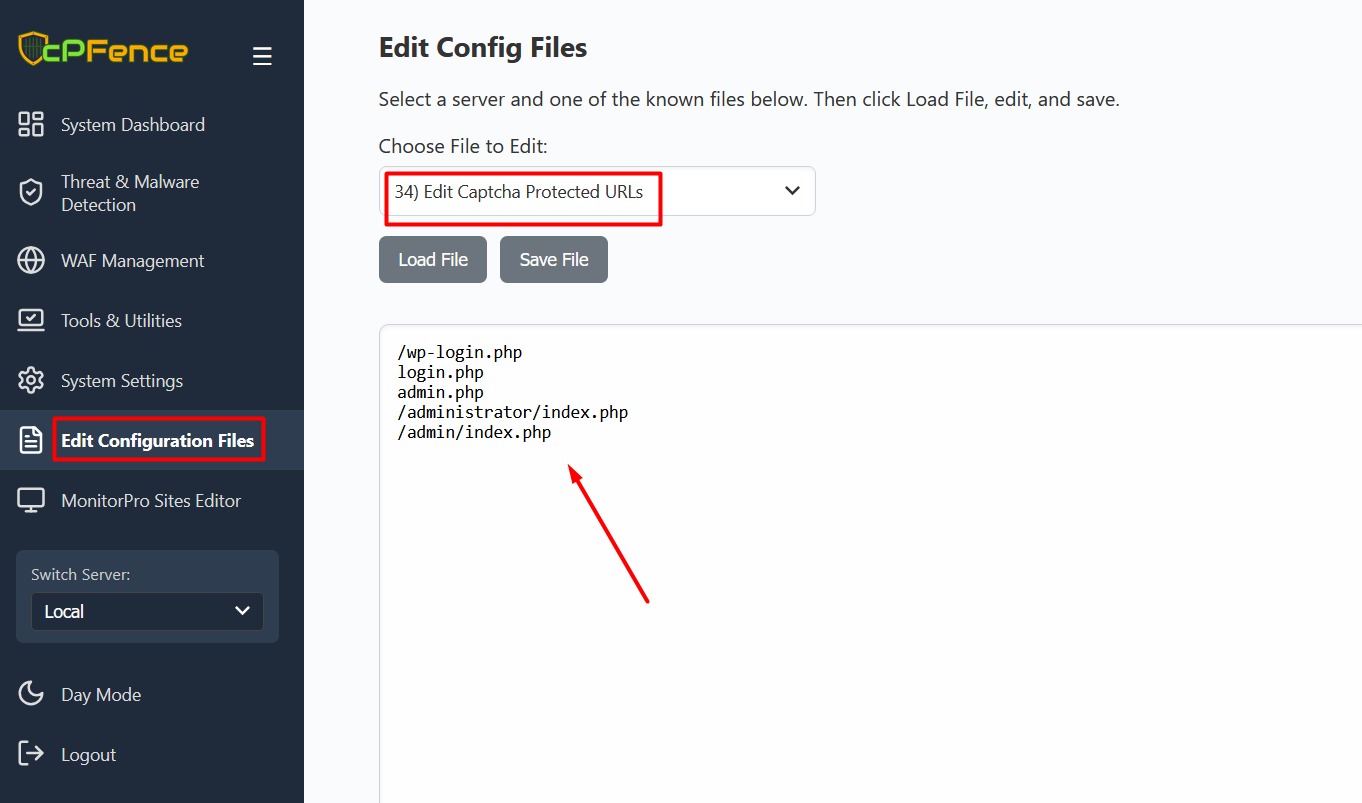 ) and click the button to enable or disable per-domain protection. - To customize protected paths, go to Edit Configuration Files → Edit Captcha Protected URLs. From there, add or remove any login paths you want protected, or edit