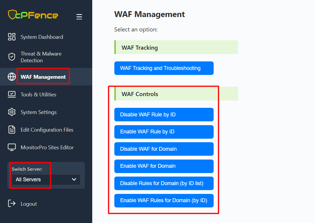 You can also manage domain-specific WAF rules using the other buttons available in the same section.