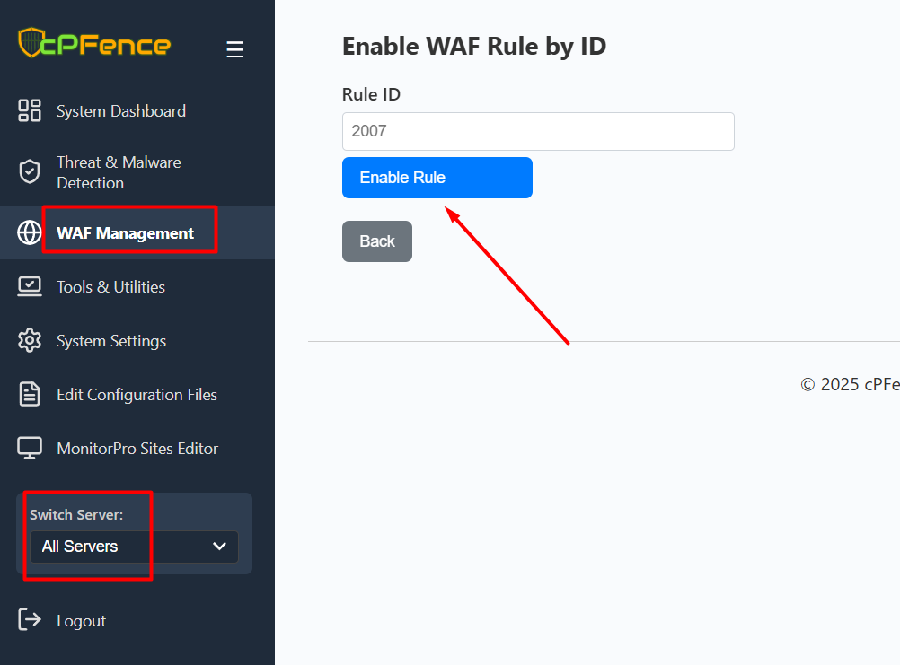 - Enter the Rule ID and click the corresponding action button (Enable or Disable).