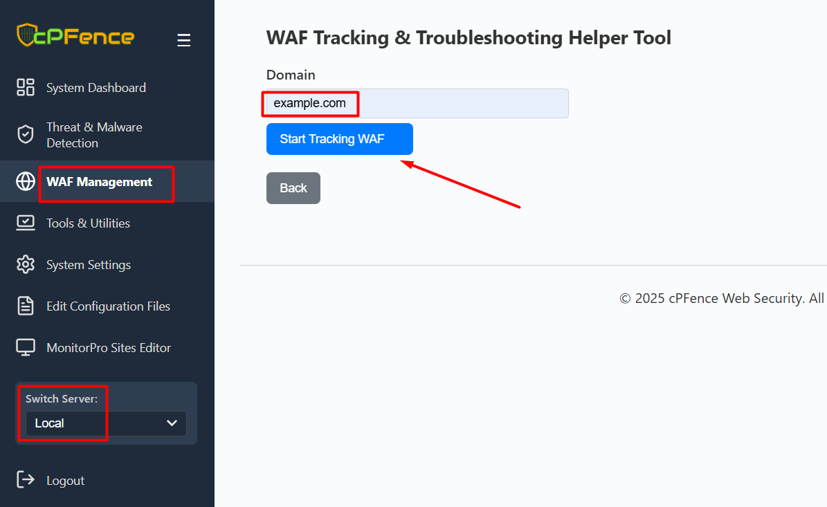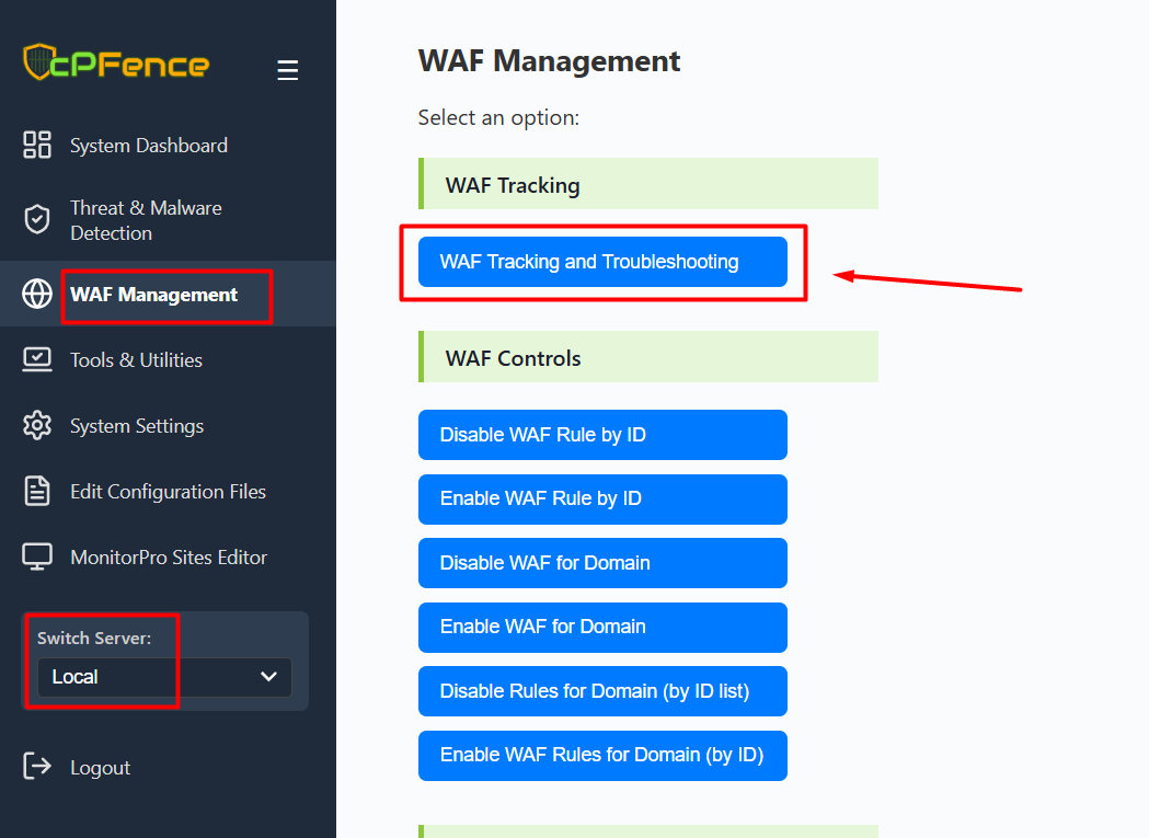Open the cPFence WebUI on your Main Control Panel server. You can troubleshoot and track WAF issues in two ways: