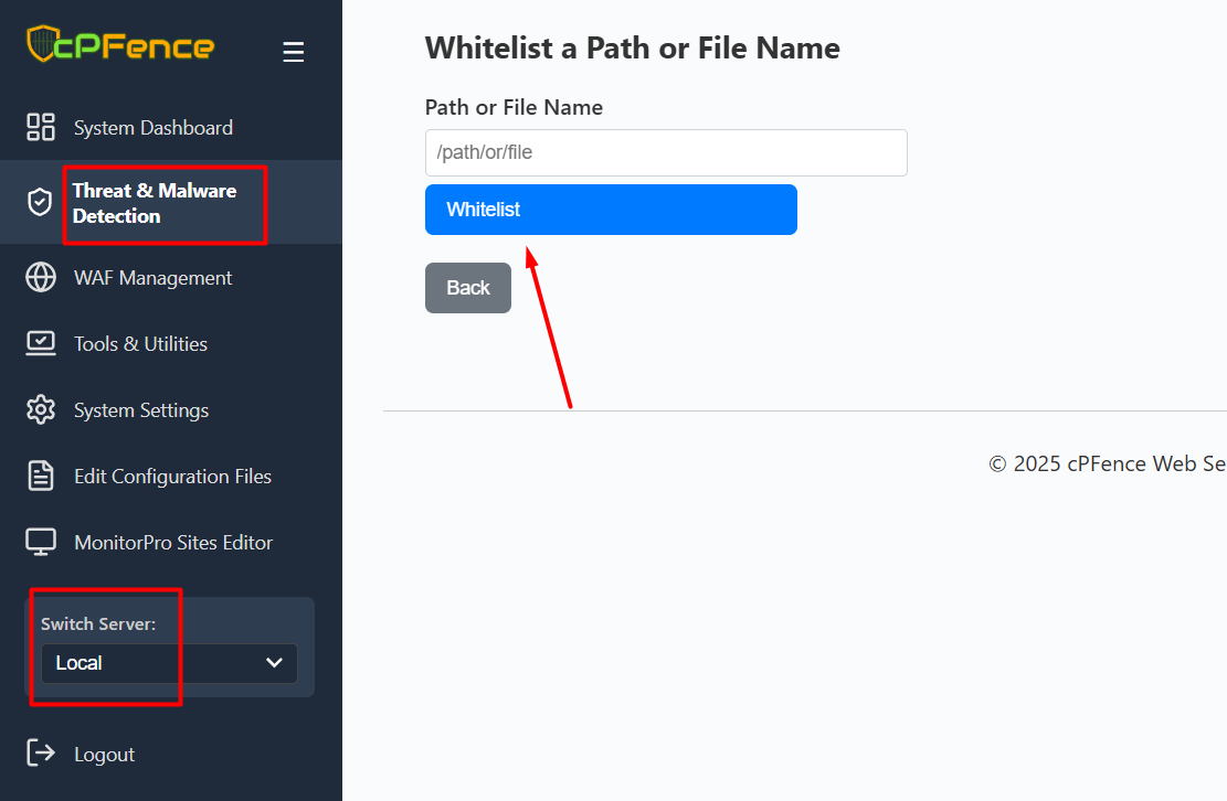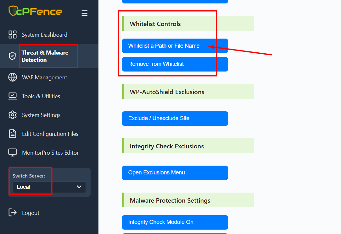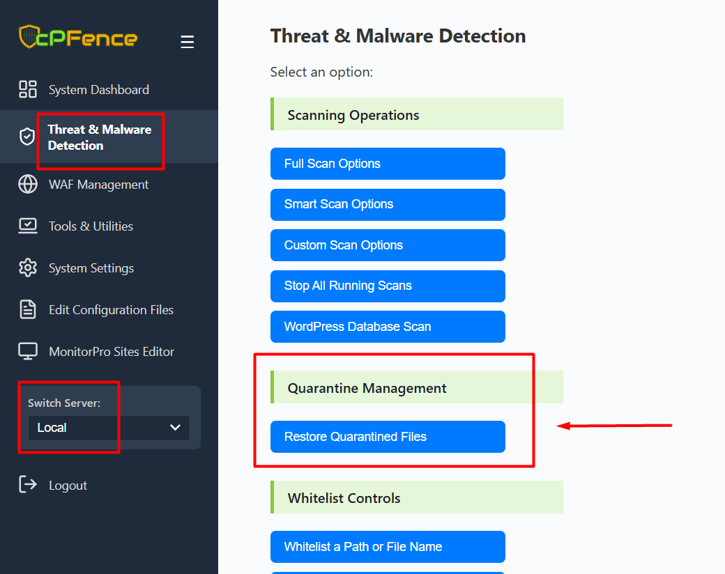 Before restoring any file, make sure to whitelist it first to prevent it from being auto-quarantined again. To do this, go to Threat & Malware Detection → Whitelist Controls → Whitelist a Path or File Name, enter the file name or path, and click the “Whitelist” button.
