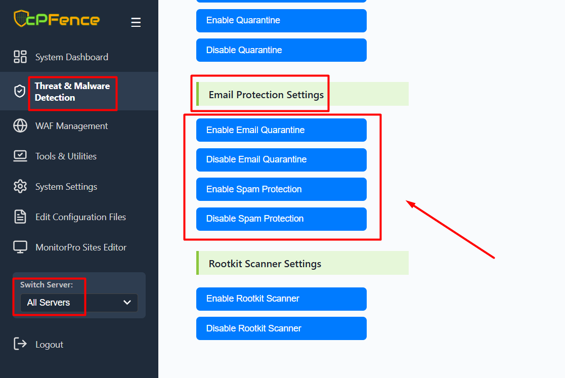 cPFence offers a powerful, browser-based WebUI for managing your Enhance cluster. The WebUI is fully mobile-friendly, allowing you to manage your entire cluster from any device—including your phone or tablet. You can enable or disable spam protection across all servers or target a specific server using the dropdown selector on the sidebar.