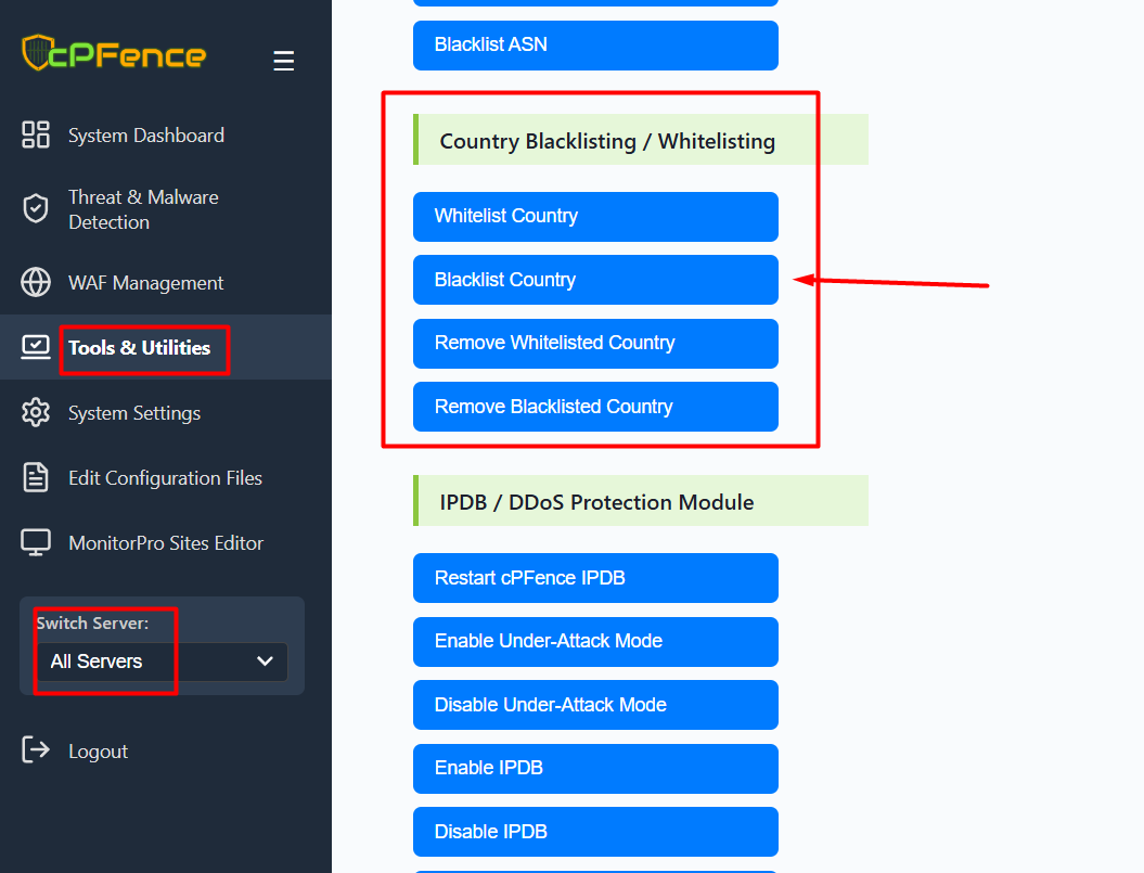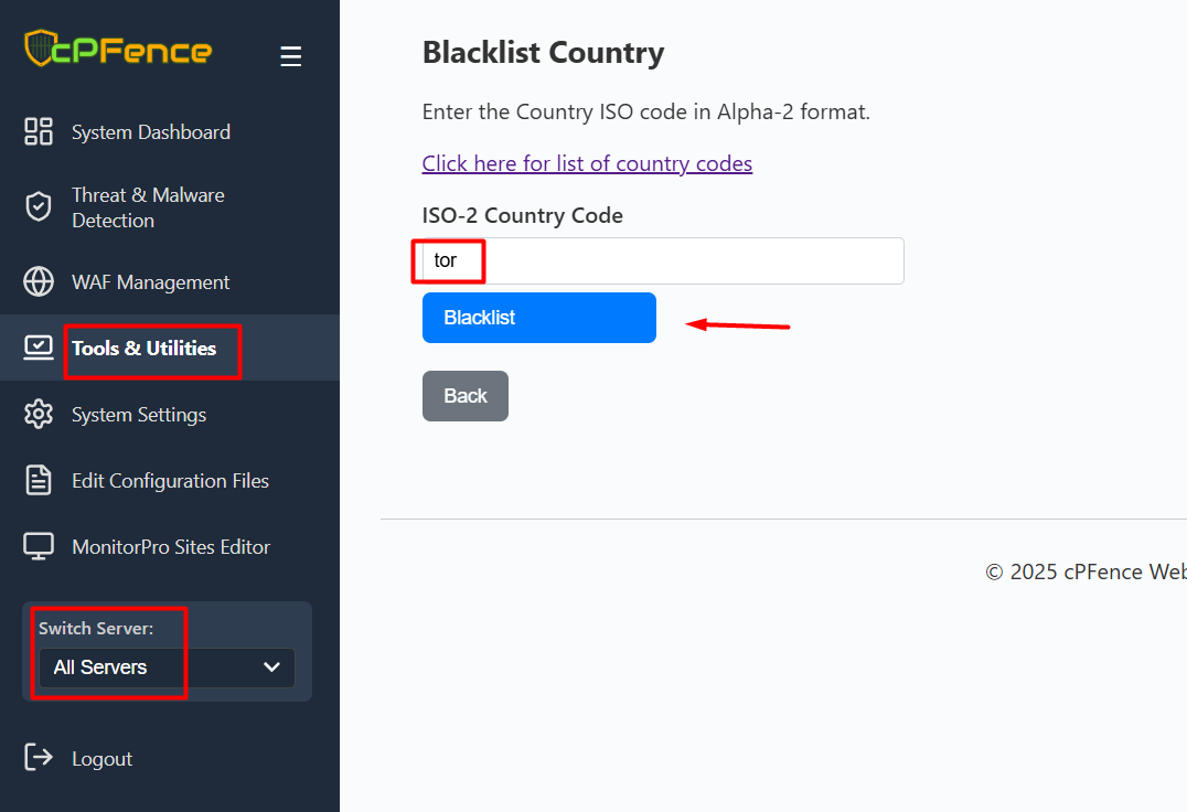 The cPFence WebUI makes it easy to block entire countries or anonymous networks like Tor, either for a specific server or your entire cluster:
