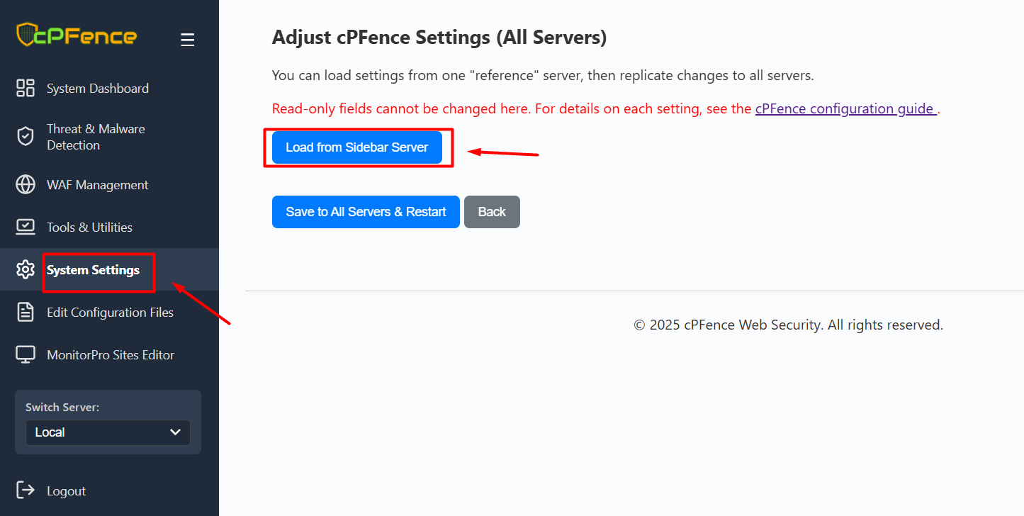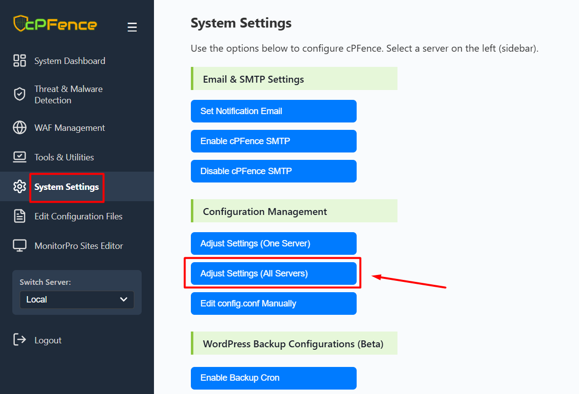 - Open the cPFence WebUI and select System Settings in the sidebar.