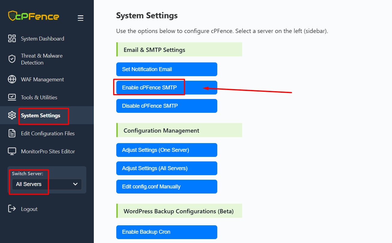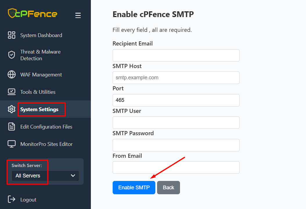 cPFence allows you to use your own SMTP server to send email notifications, giving you more control over email delivery. When enabling this feature, you will be prompted to provide your SMTP details. Follow the steps below to set up and manage SMTP for cPFence notifications.