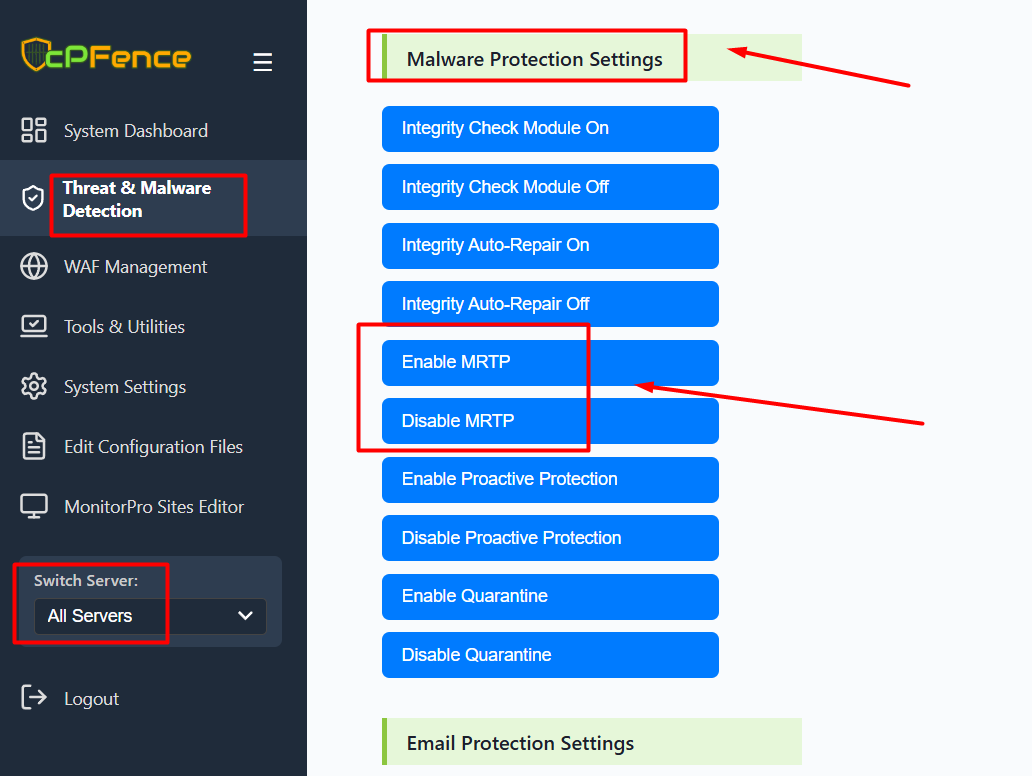 3. Use the Switch Server dropdown on the left to apply MRTP to a specific server or select All Servers to apply it cluster-wide.