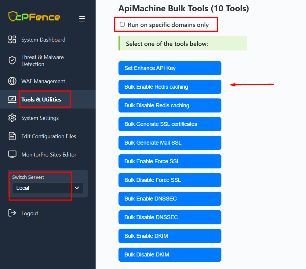 - Click Bulk Enable Redis Caching to apply Redis caching for your selected domains, server, or cluster.