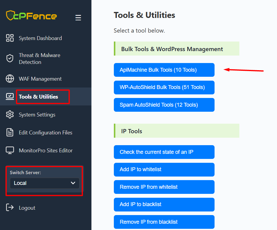 2. Use the Switch Server dropdown in the left menu to choose the server you want to manage, or leave it set to Local for the current server.