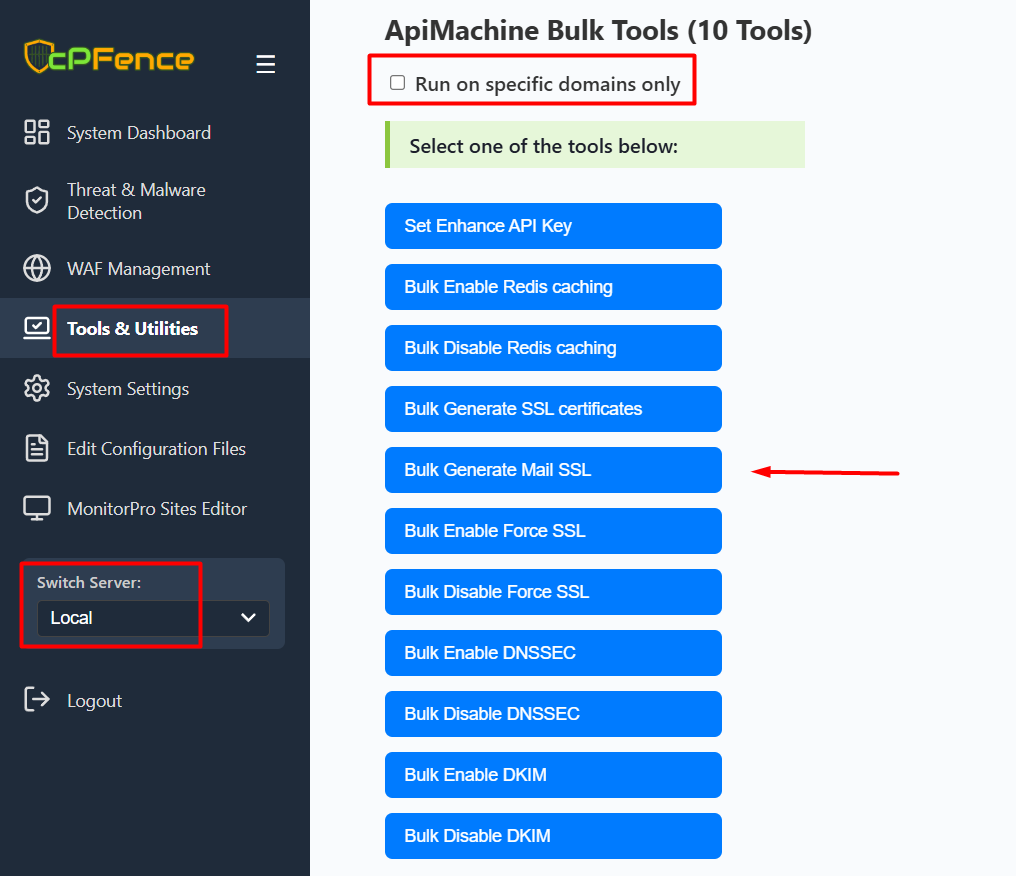6. Click Bulk Generate Mail SSL to issue mail SSL certificates for your selected domains, server, or cluster.